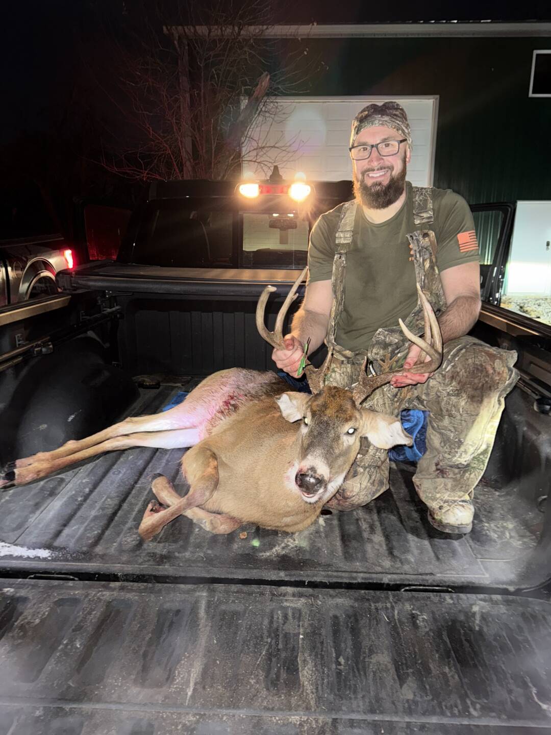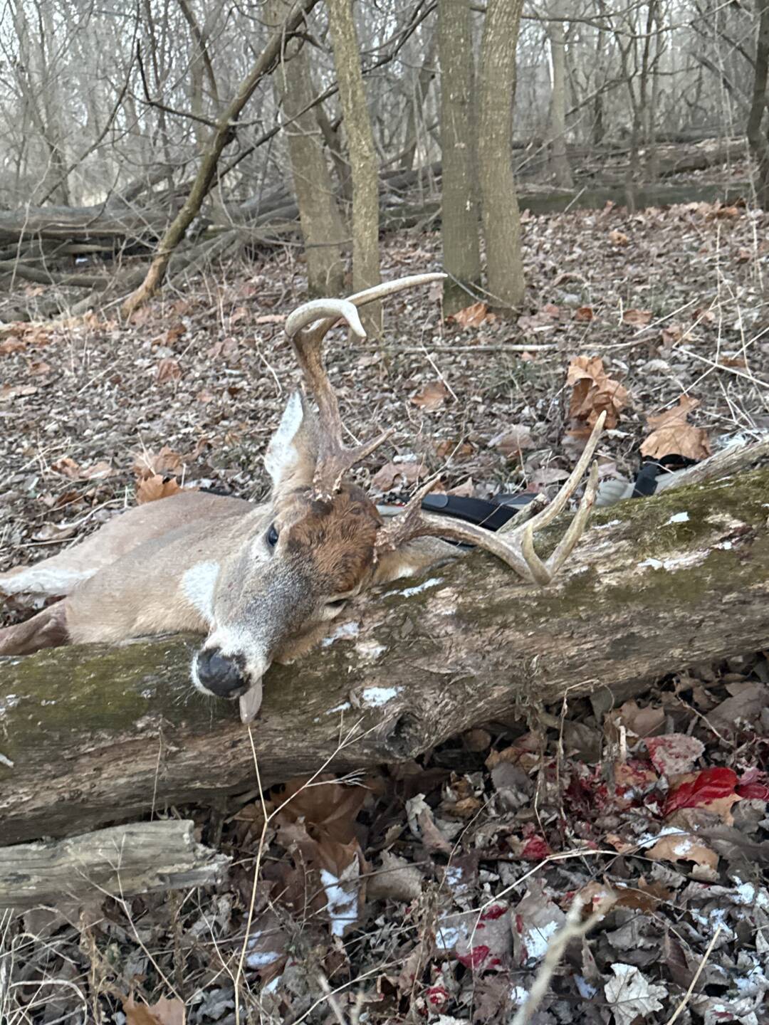 Had this guy early bow twice at 35 yards but wouldn’t step out for a clean shot. Found a spot to sit behind a couple trees off a creek. He stepped out at about 55 yards. Looks like someone hit him with an arrow high in the straps. My best buck to date.