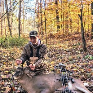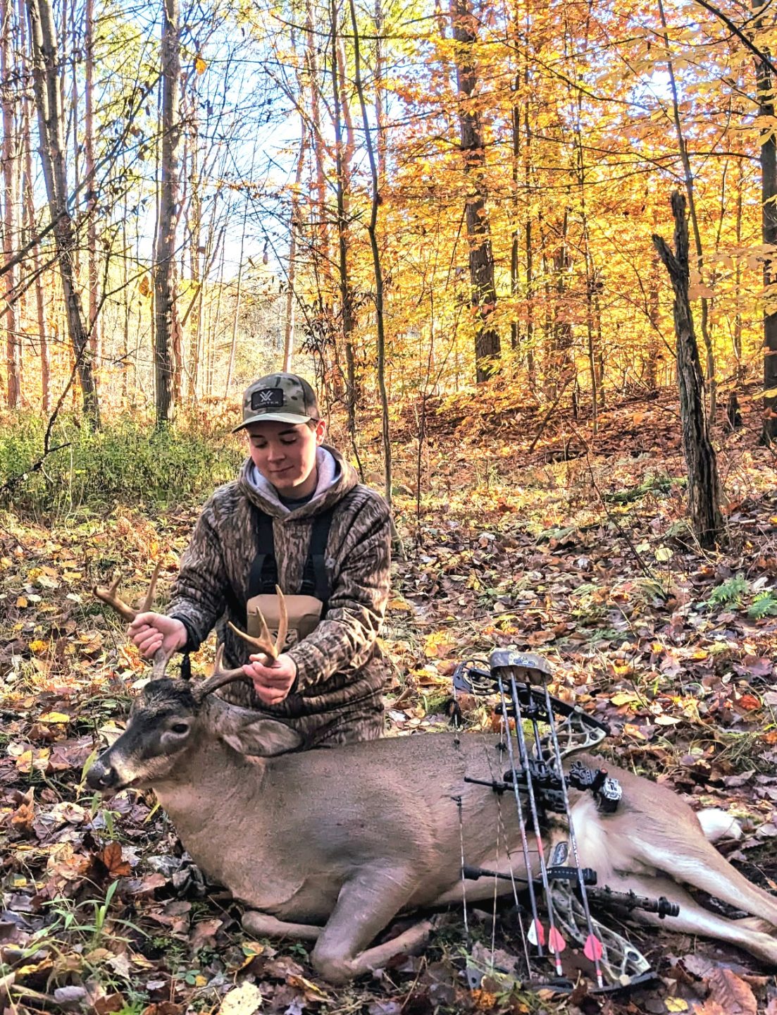 I heard a grunt off to my left of me and a doe popped out of some really thick stuff and right behind her was this buck and I stopped him at 10 yards and let the arrow fly! First deer with a bow!