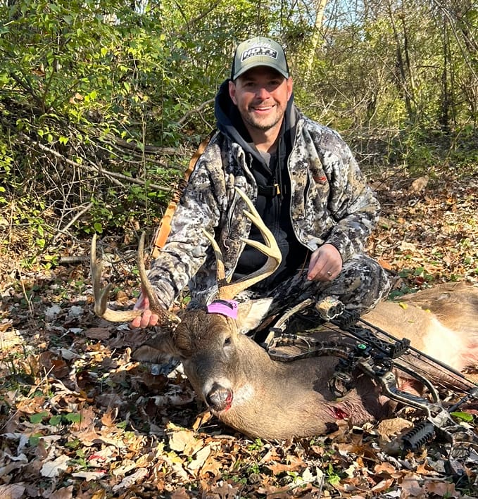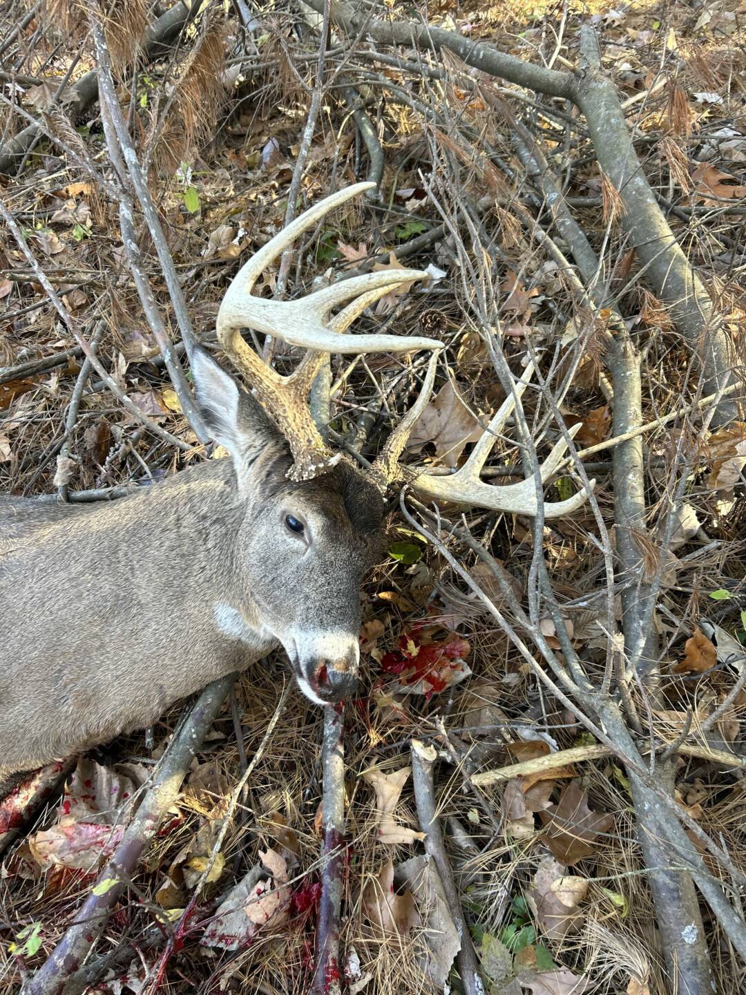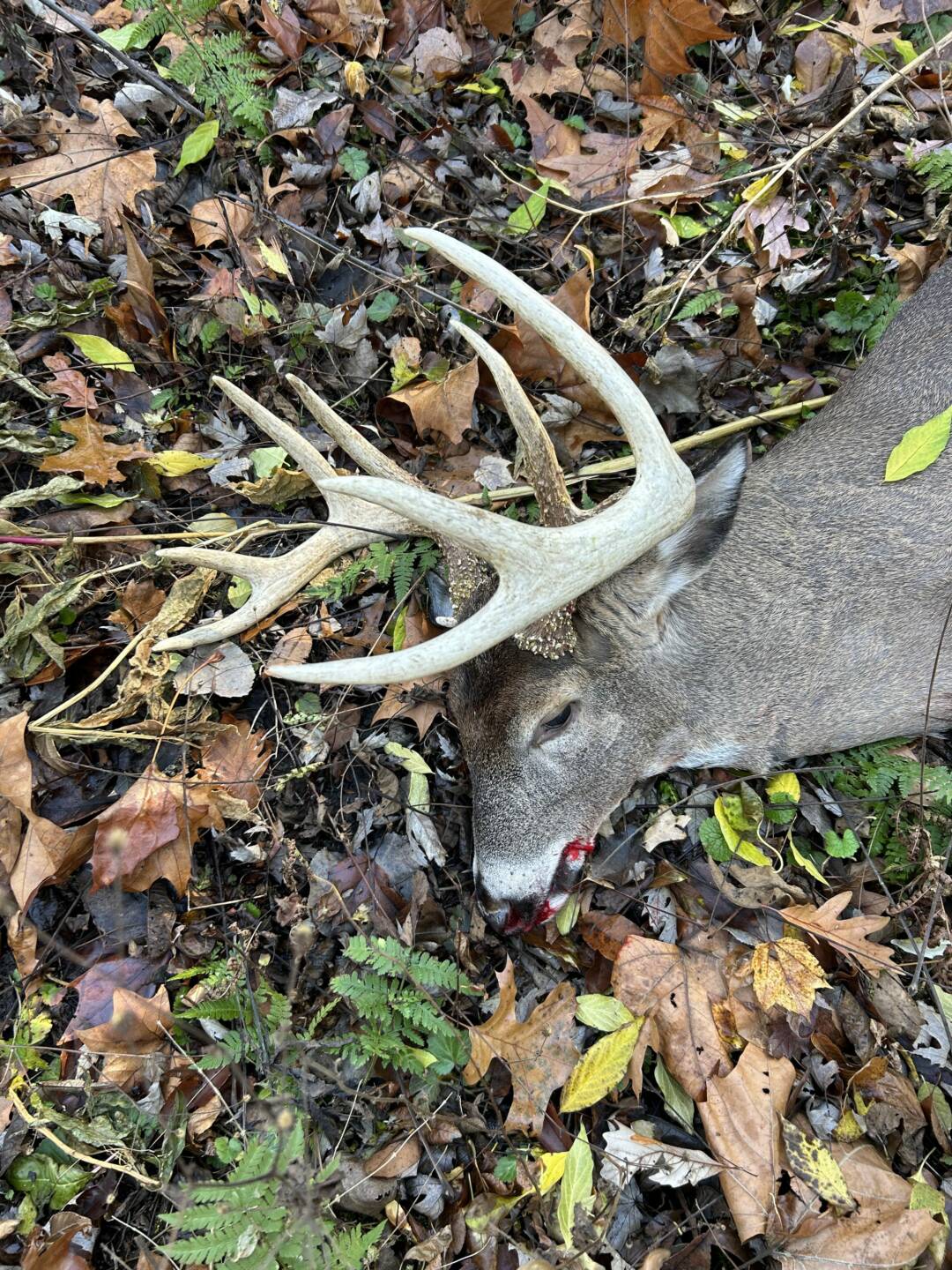Was hunting a small parcel pretty hard for the past week. Didn’t see a deer all morning until 11:00 AM. At 11:45 AM, saw 2 deer in a field and they were heading towards the woodlot I was in. The doe had the buck in tow and she worked her way through the thick stuff browsing along the way. She got past me and the buck was still in a real thick area. I waited until he started walking and drew back. At 20 yards, I hit a little forward but got one lung. He jumped and only ran 25 yards then stood still wobbling back and forth until he tipped over. Best buck to date.