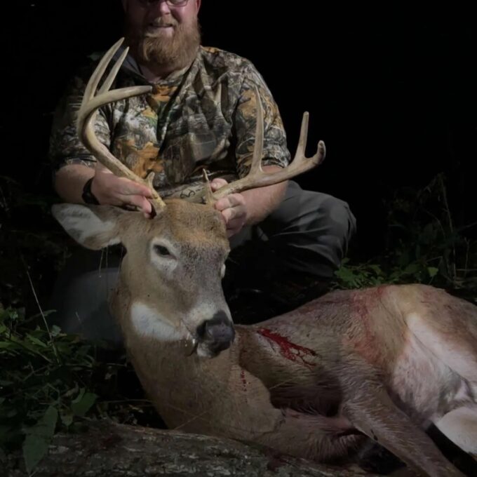 I got to the stand about 430 then at about 5 I looked up and there was a doe that made her way out view and about 40 min later that doe came back and I was watching her and then I caught movement and he came to bumping that doe stopped 32yd broad side and I let the bolt fly and he took off the track was along track but I got to lay my hands on my biggest buck to date!!