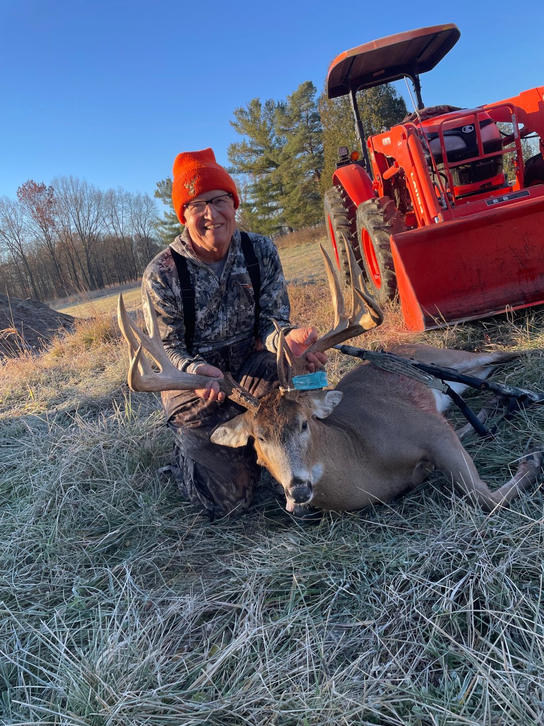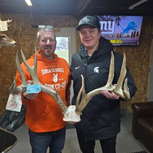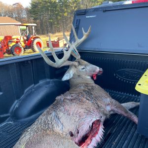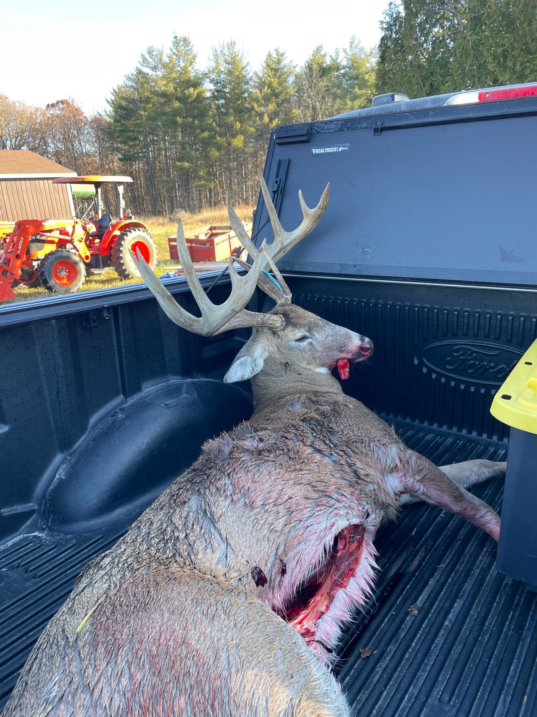 First saw him at first light at 250 yds walking next to a pond. 30 min later walking behind my box blind at 150 yds in a cut corn field. First shot was low with my 350 Legend. He only ran about 25 yrs & stopped at about 170 yards. Made adjustment & 2nd shot double lunged him, only ran about 50 yards. So far green score 173. Has broken brow time & G3, which would have made him approx 185. Field dressed 192 & is a 4 1/2 yr old.