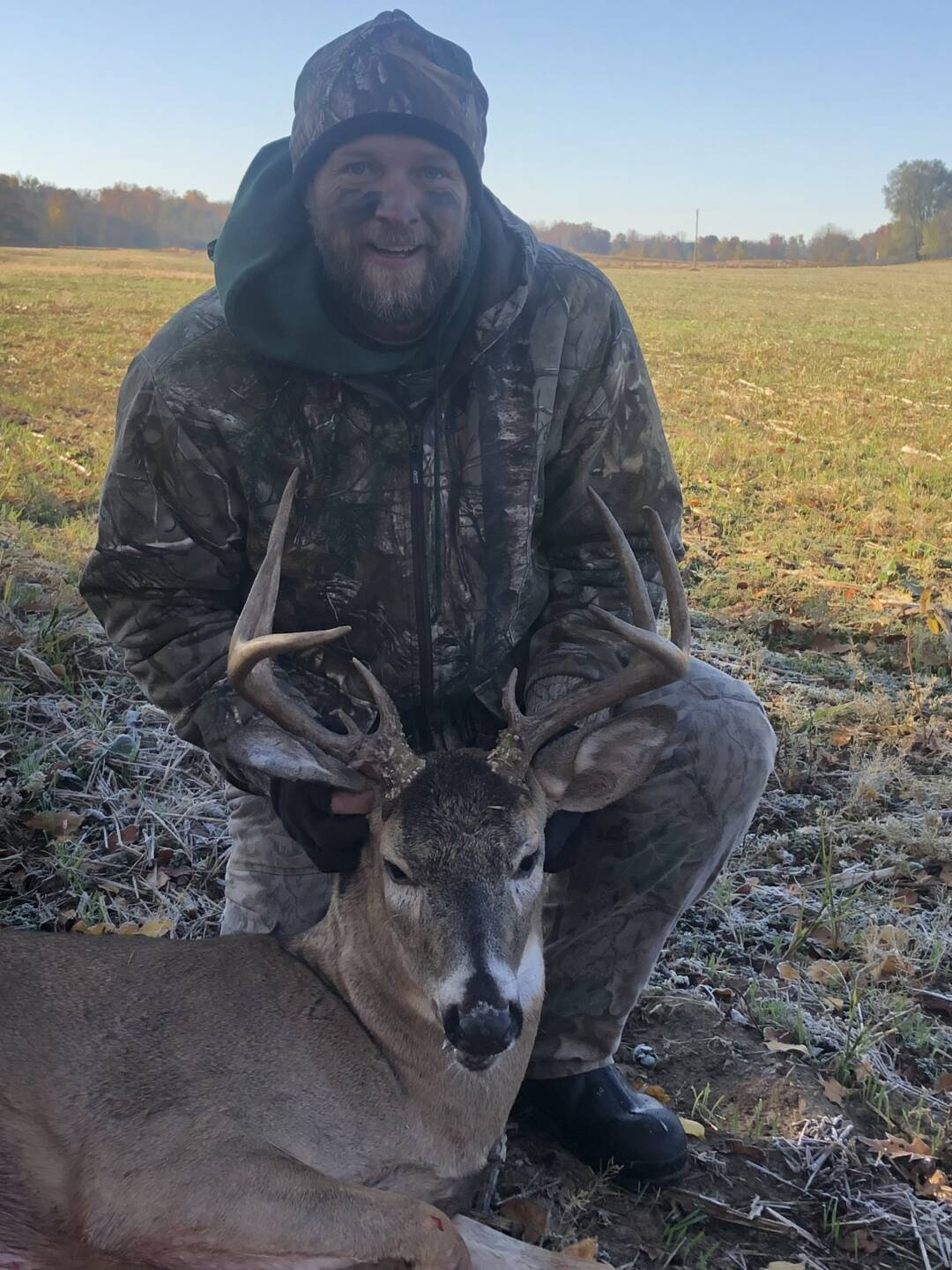 Right at day break he was in the field pushing a button buck that just walk by me. I hit breeding grunt and doe bleat to see if I could get him to react and he sure did.