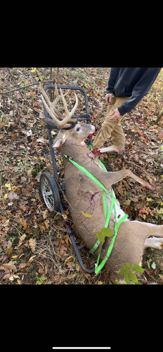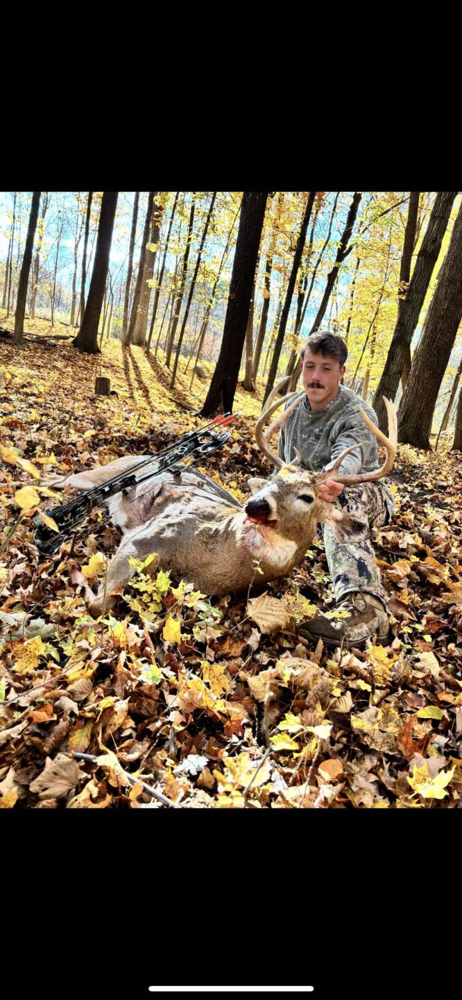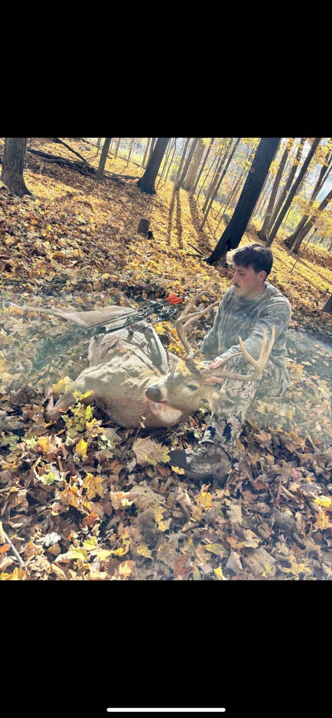 Came out after a doe and they swung by at about 20 yards. Went about 50 yards piled up.