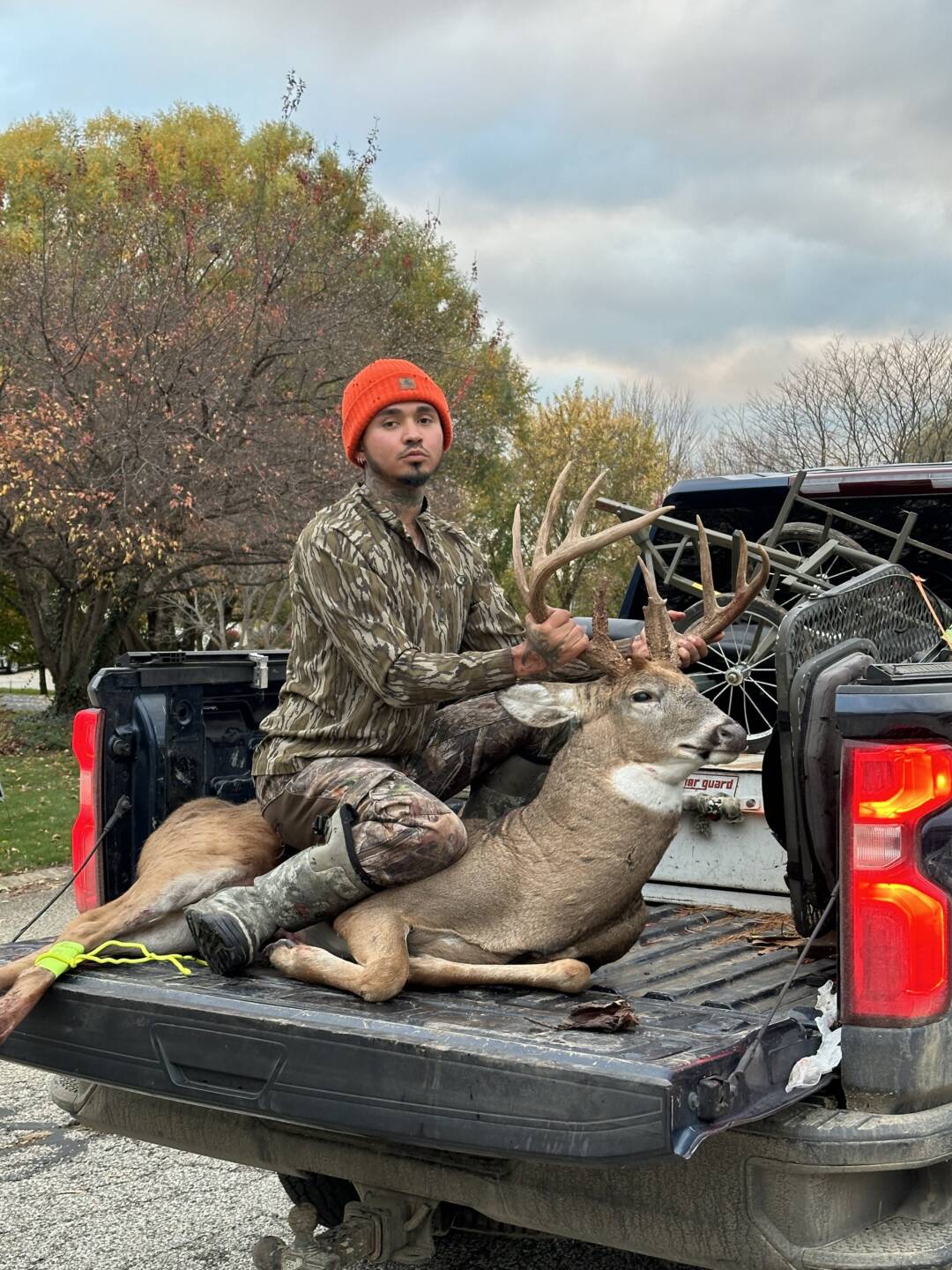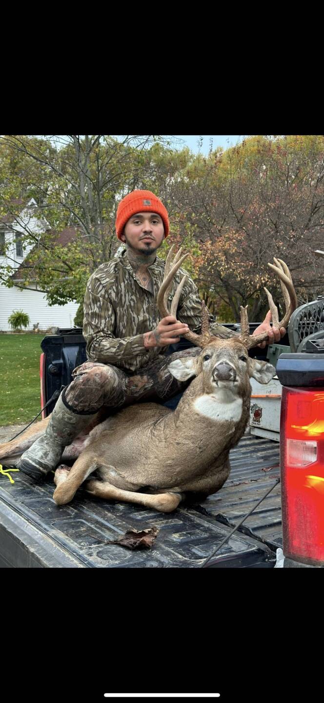 After hunting 2 days in a row and only seeing 4 doe and small 4 point. I got out of my stand around 10:30 am got lunch at ray and Al’s in galien mi came back out around 12:30 moved my stand. I was setup around 1:35pm I rattled and grunted at 1:50 @ 2:00 pm just how I pictured the perfect scenario my buck popped out at a slight jog with a limp walked in at 15 yards hard quartering towards me I bleat to get him to stop in shoot complete pass through he runs 30 yards and expires. Biggest buck to date antler wise