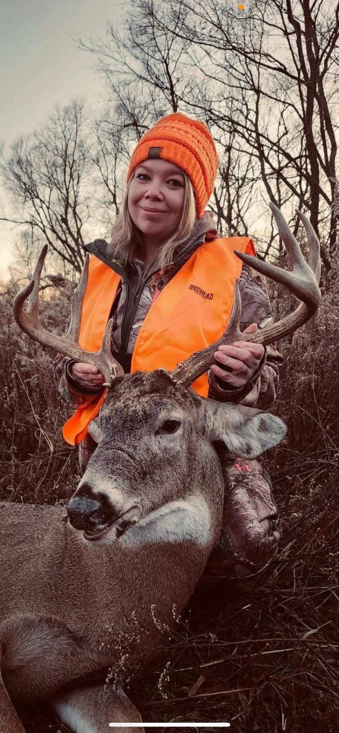 Went out hunting with my husband for a date night. Sat overlooking a patch of thick brush, this buck came out and fought with another buck for a few minutes, then went back into the brush and disappeared until about an hour later when he popped out right in front of us. He worked a scrape for a minute then walked right out into the open and gave me an easy 60 yard shot. The rest is history. Personal best buck to date.