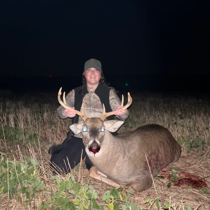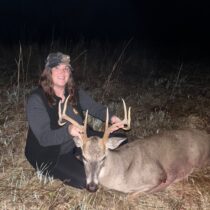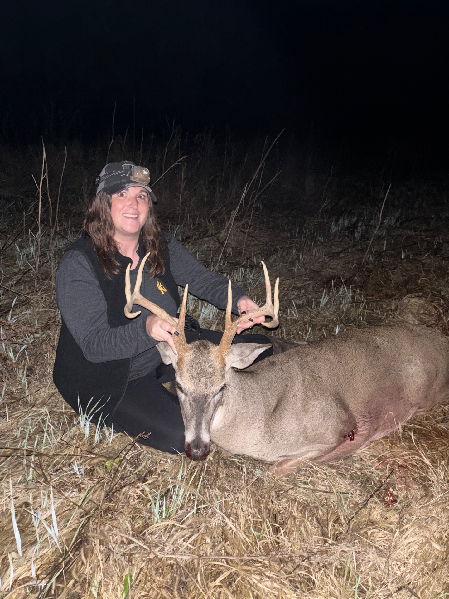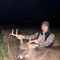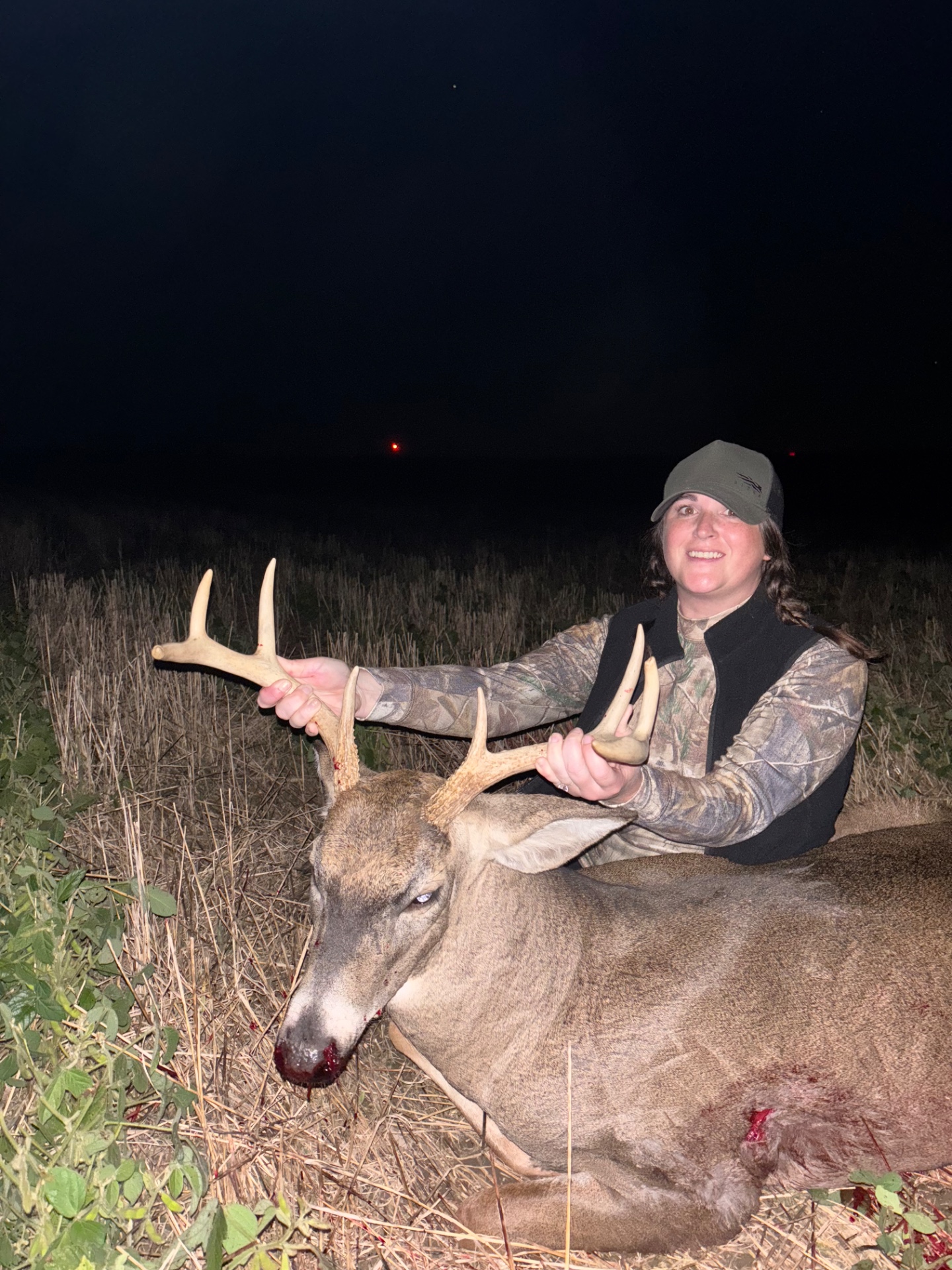Not even a week after taking my 9 point, this tank walked out at 44 yards & headed the opposite direction. He suddenly made a turn back to work a scrape and stopped at 30 giving me the perfect shot! I watched him die at 142 yards from the blind, while 28 other deer were out in the field. What an incredible hunt!! Tagged out early in the season with two nice bucks! Major thanks to my fiancé, Justin, for all the support & encouragement this season!