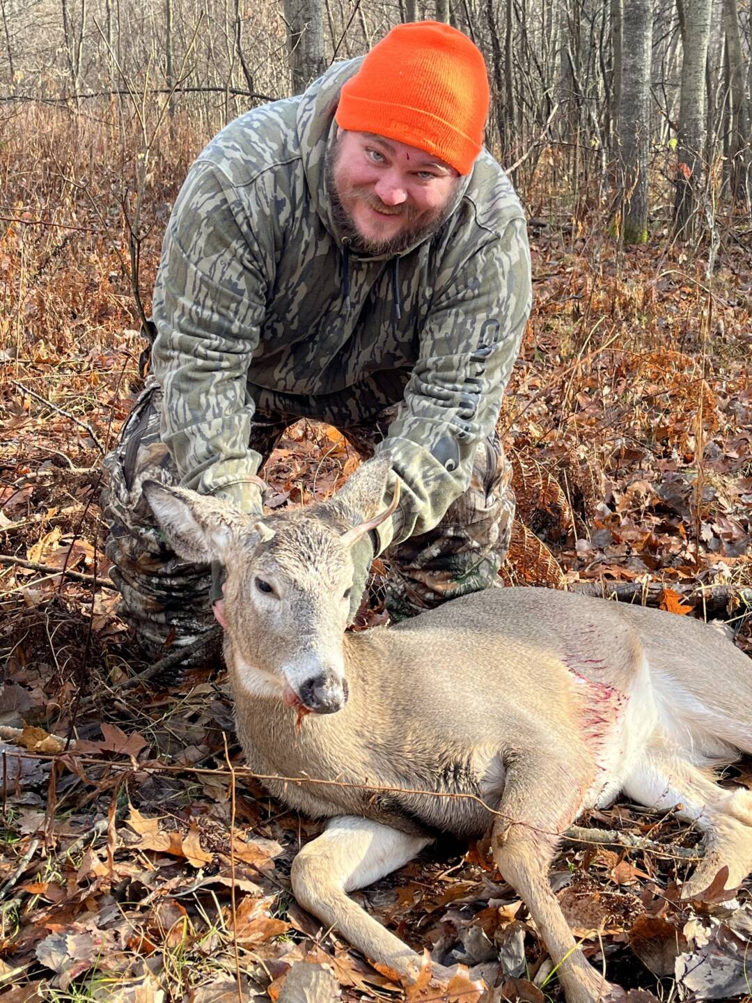 Was taking a drink of coffee when I looked up. Saw a deer walking in front of my main window in my ground blind. As soon as he walked into my view I thought he was a doe as his one antler was to my opposite side. I slowly put down my coffee and shouldered my rifle. Pulled the trigger and he mule kicked up and ran about 35 yards before dropping. He was 45 yards out in the trees.