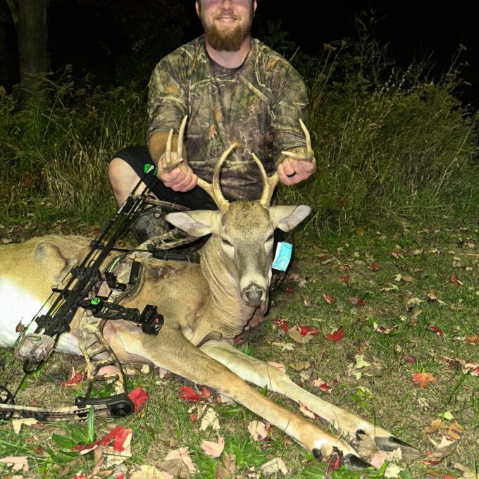After 8 or 9 years of hunting I was finally able to get a buck. I always had hoped that someday I’d get one with my bow and it happened! Since becoming new parents Lex and I have been very very busy which is to be expected and totally great. I was finally able to get some time today after work to hunt for the first time this season. I went out at around 3:45-4pm and sat the edge of a standing corn field. It was kinda warm so it was a very comfortable sit. This guy came through the corn at 6:15, he was standing under a tree with a low hanging bunch of branches. All I could see was his antlers and head for about 15 minutes, I kept ranging the spot that I thought he would step out to and it was exactly 21 yards. He ended up walking away from me and I was so bummed, but he turned around and eventually decided to come back my way. He gave me a quartering toward me shot at 20 yards and I took it. It hit just forward of his shoulder, he took off and I saw my illuminock stuck in him. He went crashing through the woods and broke the arrow off with about 7-8 inches still in him. It was a perfect shot, right through the central boiler. I’m so thankful to have such a great friend Nehemiah Rettig who is also my neighbor. He helped me get it out about 1000 yards to my truck