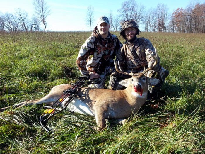 It was my favorite hunt of the season so far because my brother in law Josh and I were finally able to get out together with our busy schedules and distance making it a bit more difficult than seasons past. So my father, bro and I were able to hunt a beautiful super frosty November morning together which just makes for good memories regardless of the outcome. After much deer activity throughout the morning, we were about to pack up when I noticed a doe moving her way to the south of me, so I radioed Dad and Josh to hold on a moment. This is where things get hectic in a hurry. I’m standing up in my stand, facing south watching this doe when all of a sudden Josh yells through the radio – I can’t remember verbatim but basically BUCK coming up from the north!!! I quickly turn around to see this 8 point literally trotting straight towards my stand – all i have time to do is grab my bow – bleat him to a stop estimate a quick range and let err fly. Arrow hit high which put him down but kicking, so I quickly climbed down and put another arrow in the rib cage which put him out for good! From the time to Josh yelling through the radio to me shooting the buck was probably less than 60 seconds. Had he not radioed me – I would have never gotten a chance. Thank you Lord for communication and the opportunity to arrow a beautiful deer with the best hunting pals a guy could ask for.