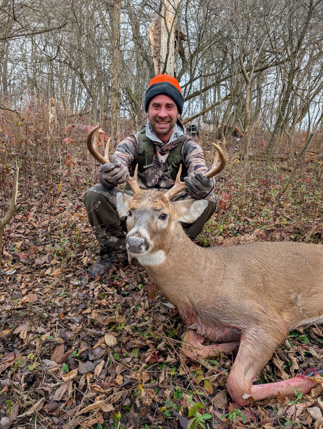 Had a few encounters with this buck during archery and never got close enough. Opening day I had a hunch bucks would be cruising edges of bedding for does. That’s exactly what he did at 8:00. Shot him at 60yards with a Traditions 44. Mag