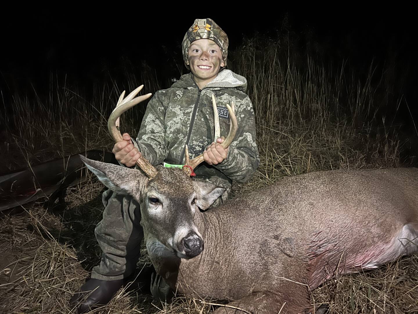 We saw him at 60yrds walking away from us, so my dad grunted at him 3 times. He stopped, turned and started heading our way. We were on the ground, he walked out in front of us at 25yrds and stopped. I shot, he took off and we saw him crash 80yrds away!