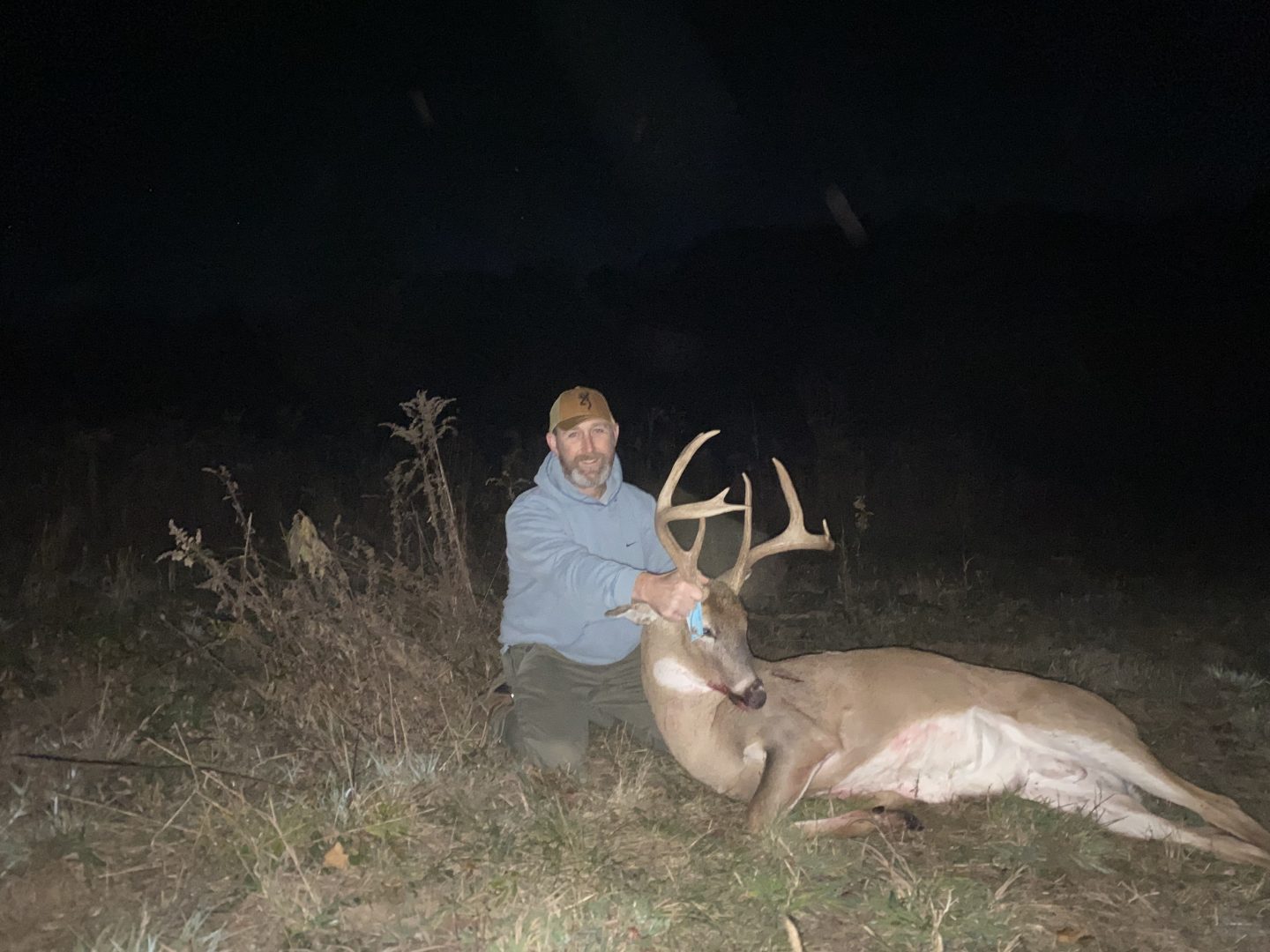 We had this buck on camera for two seasons now. Never saw him on the hoof. Until Thursday evening for the first time. He came down the ridge out of the thick stuff just before dark where I shot him at 33 yards right through the front left shoulder. He only made it 25 yards back up the ridge where he died.