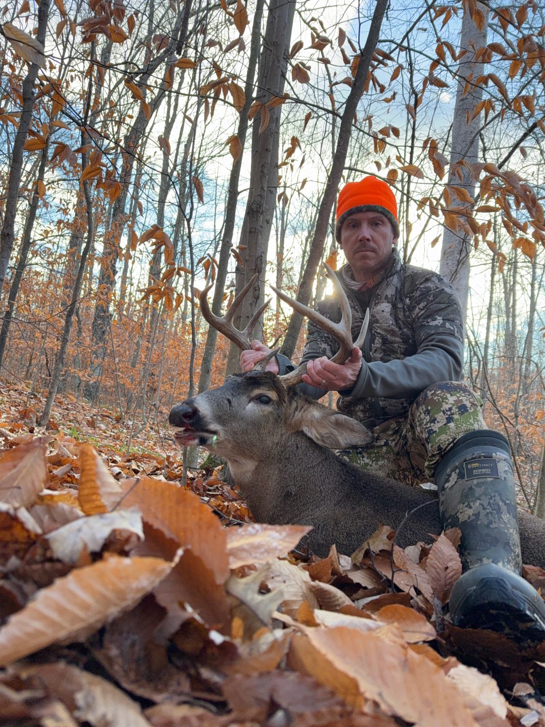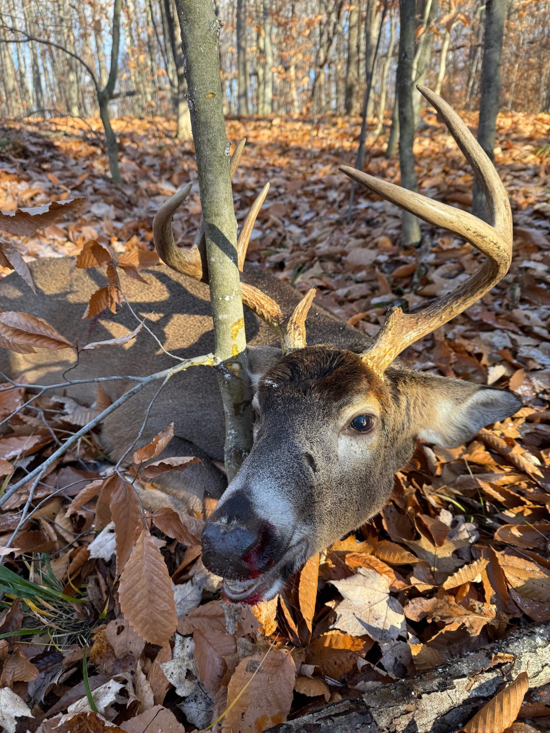 After the snow and wind subsided I had a smaller buck near my stand and this larger one about 80 yards away. He gave me a great shot with my .270. Heard him crash and he wrapped his antlers around this small beech tree.