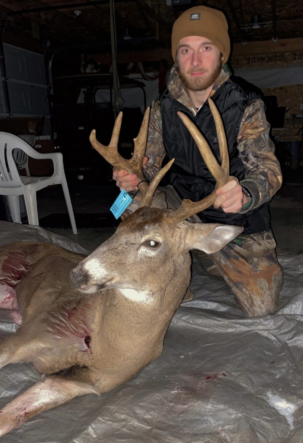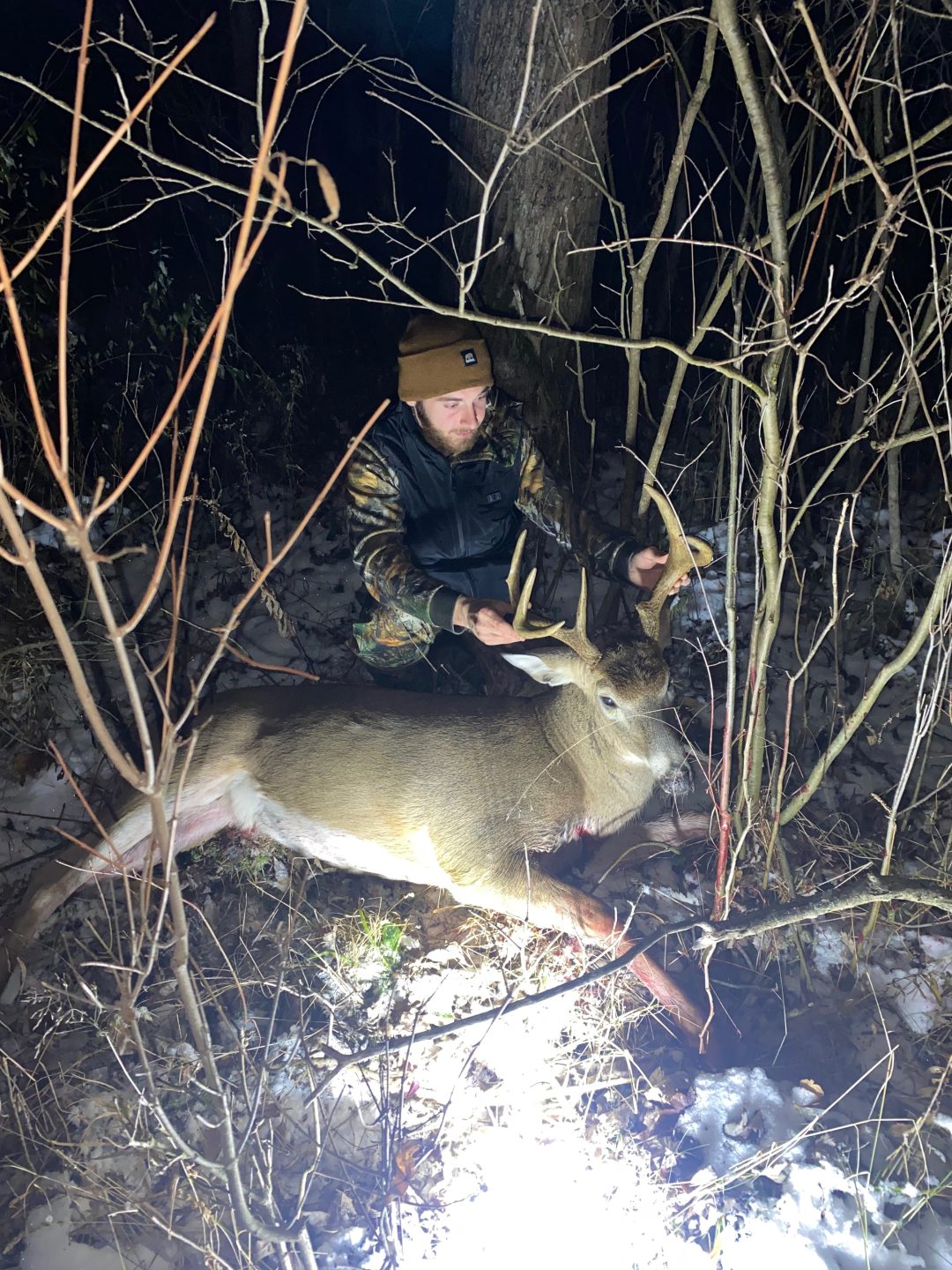 locked my keys in my truck before heading out hunting. Took over an hour to get them out. Decided I was still going hunting with an hour and a half left of light and Still had to walk out to my spot. As im halfway to the back part of the property there were 4 does working through, I had to stand still for 20 minutes to let them walk through without spooking them. Finally get to the back of the property, didnt really know where I wanted to sit exactly. Decided on a brush pile off to the right. Got settled in with 40 minutes left of light and It Was a slow night until 5:40pm. With 12 minutes left of light I made 3 loud grunt calls and not long after that he came in running right up to 25 yards hard quartered to me. I waited for a better broadside shot but he was catching my scent from the trail i walked up. So I took a hard quartered to shot. He didn’t go 60yrds, piled right up!! I Dedicated this season for a mature buck, passed up many big does, had a shot on a big buck in October, he survived. Then 11/10/25 got it done finally, with a story to remember!!! My First Buck As Well I Couldn’t Be Happier, old 7 point with a lot of mass!!