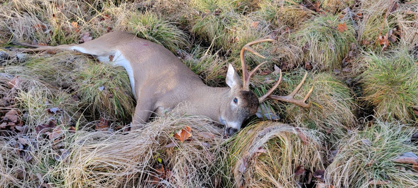 Watching a doe wandering around for about 15 minutes from my blind and he came out and gave me a great shot at 22 yards. My biggest buck to date.