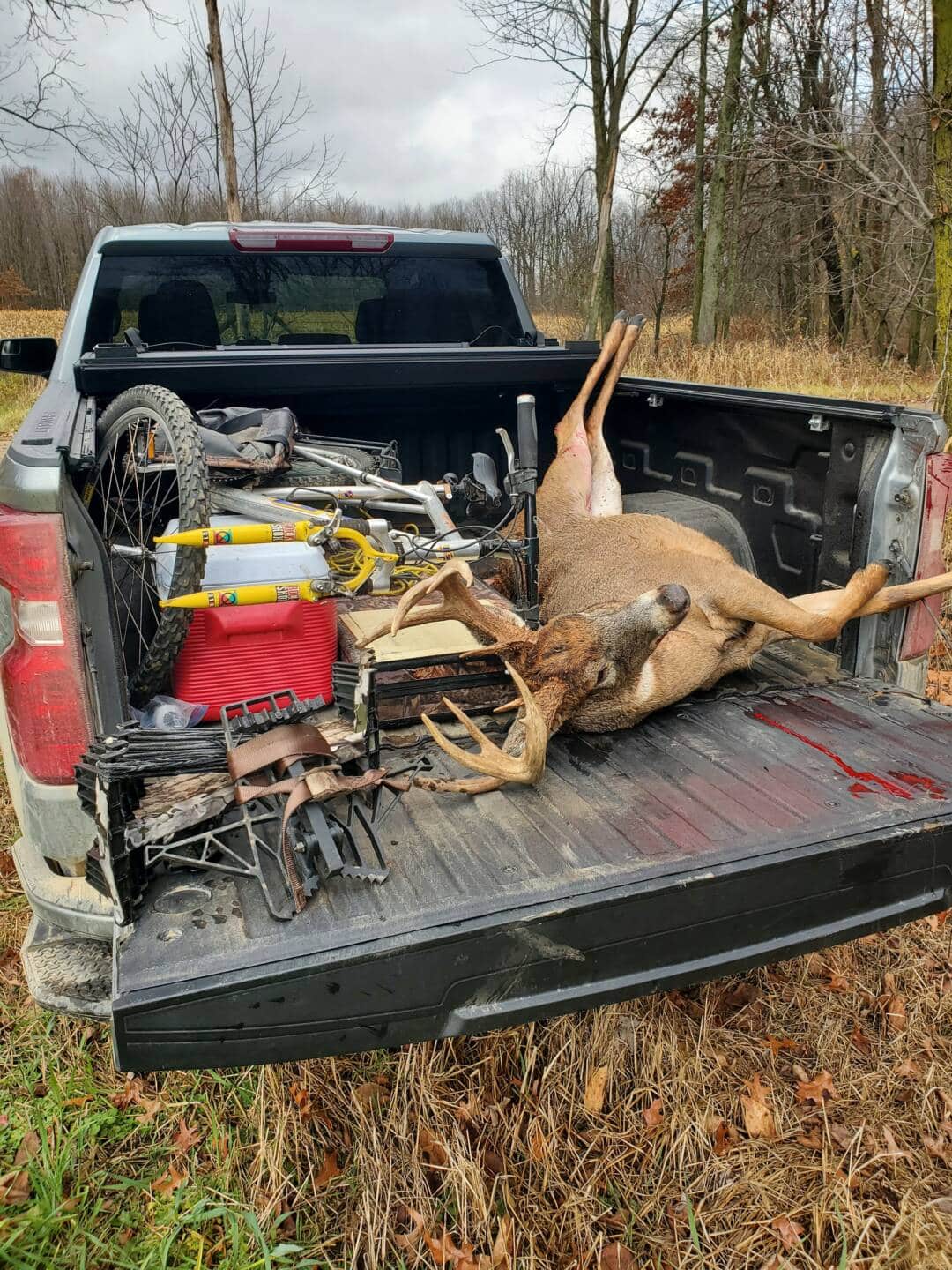 First hunt in a new tree, 75 yrds off the rd. Set up down wind of bedding, and caught him cruising and scent checking trails. Shot him at 12 yrds from the tree while swinging 20 feet up in a saddle. Epic rut hunt on a big MI bruiser.