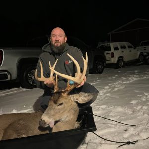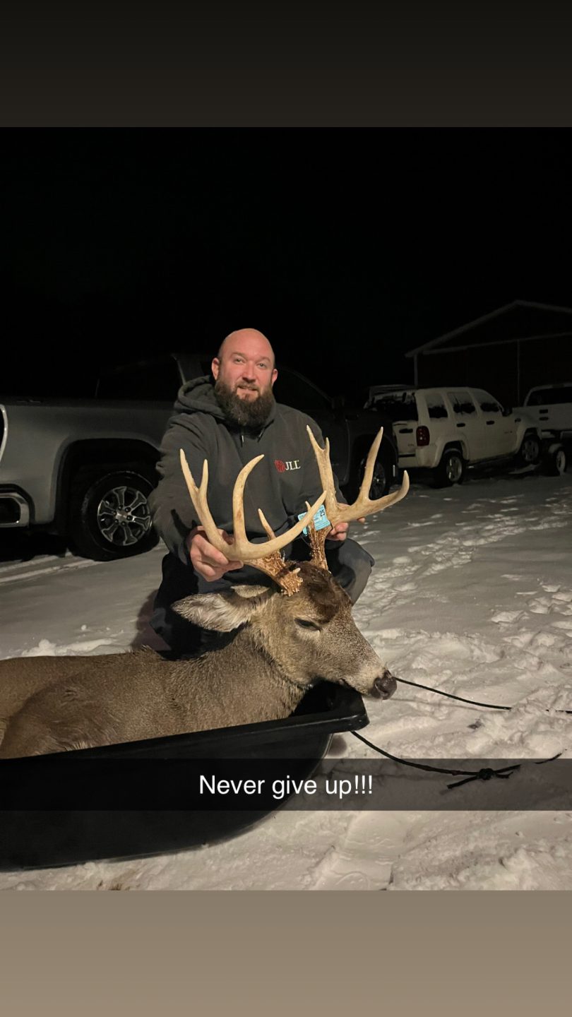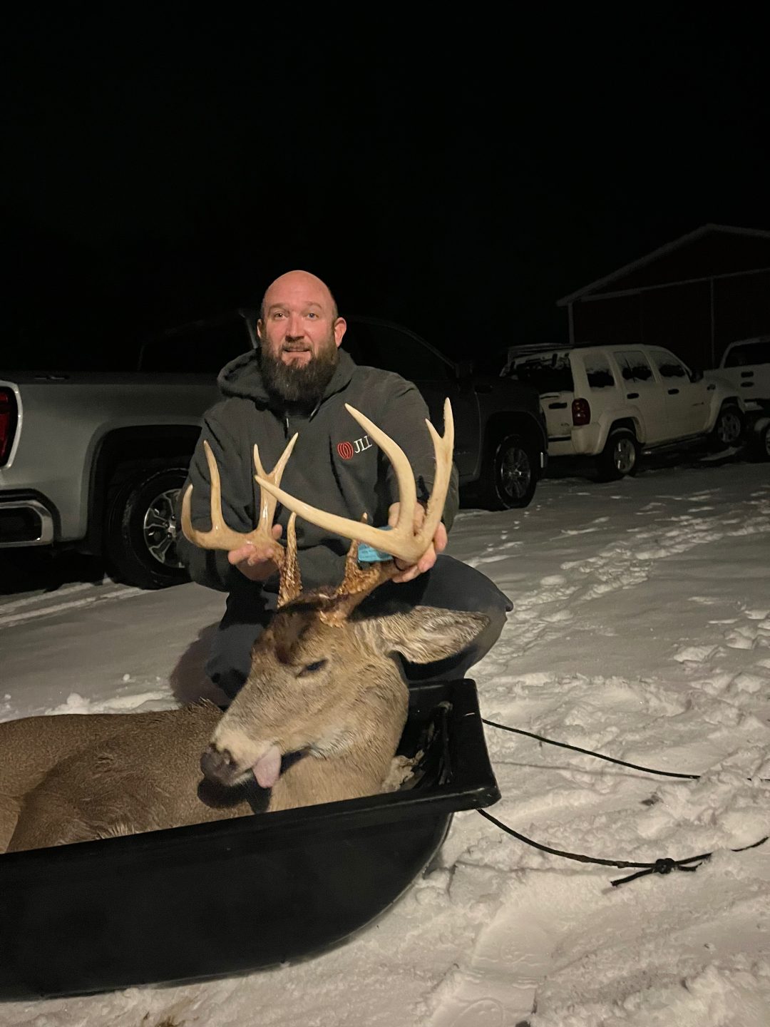 A night I’ll never forget. As I’m videoing all the doe fighting in the food plot. I catch a glimpse of a rack in the very back. I put the phone down and pull up the .350 and let one rip. I’m in disbelief so I climbed out of the blind and head back to the house as the wife and kids are home between 5:10-5:20pm and Kolt’s going to want to help track it. I get Kolt all suited up and we head out after 45mins. NO BLOOD WHAT SO EVER. So we start searching hard in the thickets and on there runs. Nothing after an hour so I take kolt back to the house and drop my hunting clothes as I’m sweating my ass off now. I call the brother in law ( Josh) and he pushes me to not back out. I headed back out to the first trail. I fined blood 20 yards where Kolt and I left off. He ended up being 40 yards down the river bank. If it wasn’t for Josh pushing me after no blood I would have gave up. Thank you again for pushing me and helping me drag this monster up the 100 ft drop off. My back is definitely feeling it this morning. This one’s going on the wall for you Terry i know you where with me R.I.P.