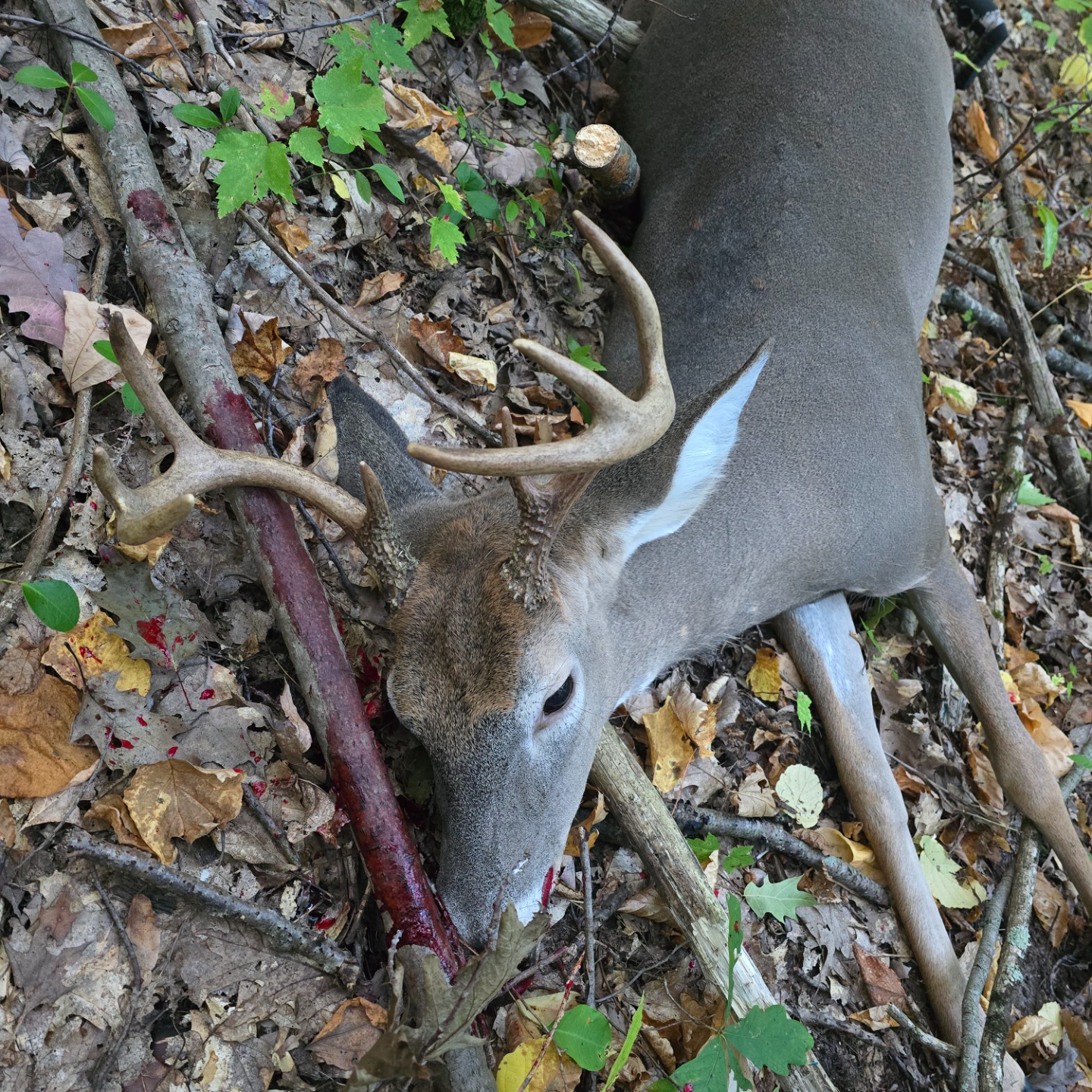 Sitting about 20′ up and he’s 8 yards quartering away walking hard. Heard him drop at less than 60 yards away through the trees.