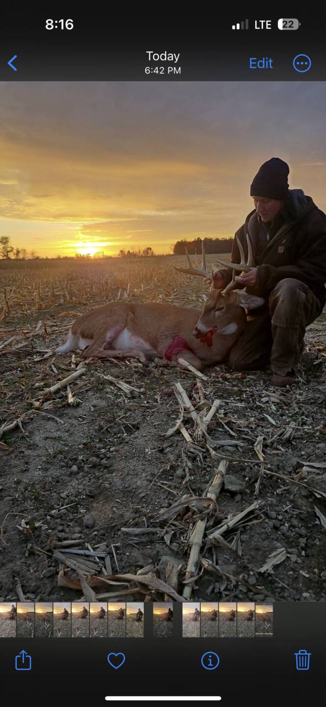 I have been hunting this spot the whole month of October! Been watching him just out of range! Went out one Sunday night to sit a littler earlier then normal! Heard some noise coming from the woods got positioned out pops a doe and a fawn just about sat the bow down and out pops this Beaty watched him take two steps and the rest is history! Beautiful double lung and watched him drop right in front of me couldn’t have asked for a better night!