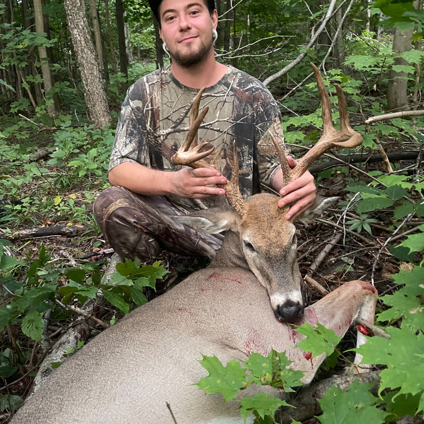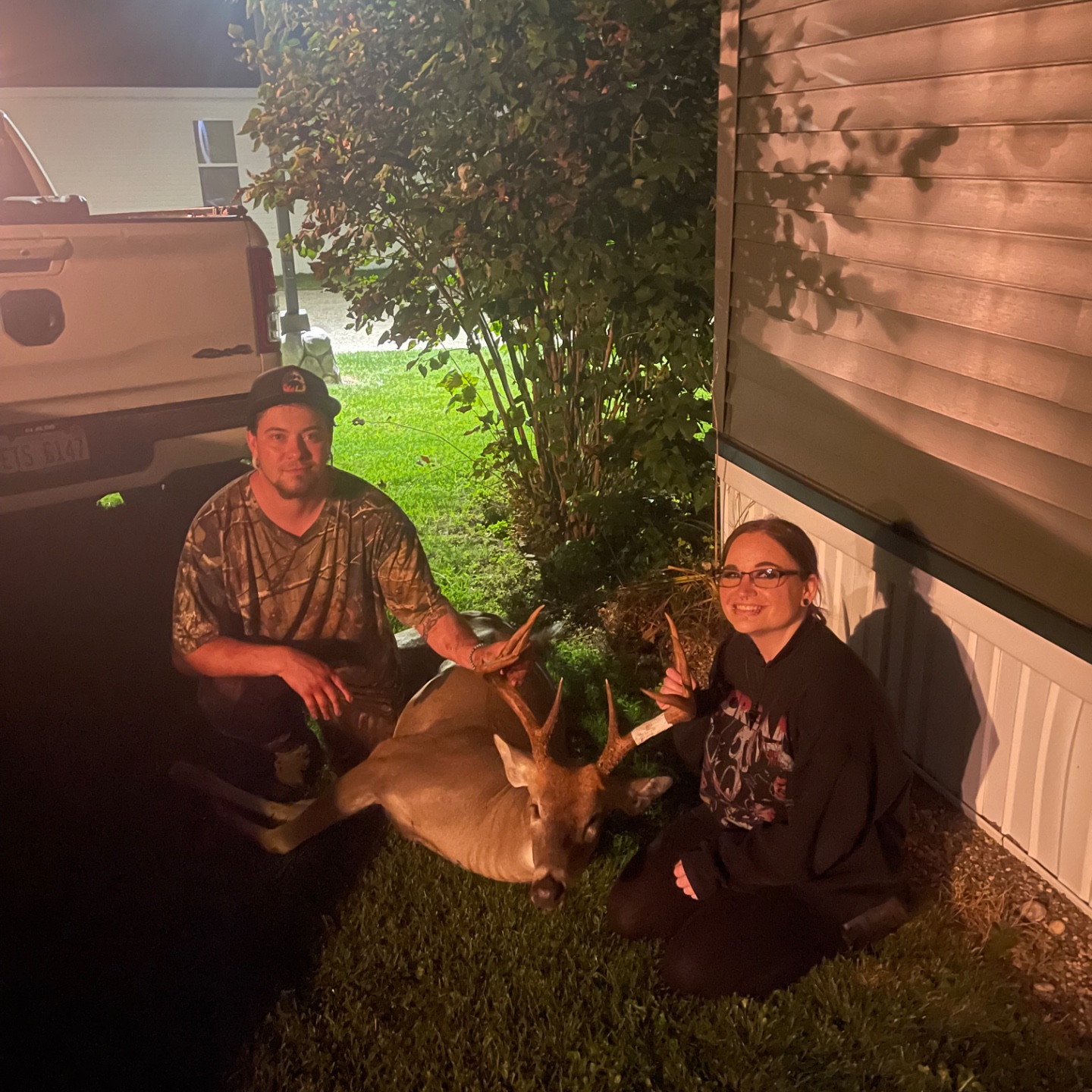 I as sitting there with the girlfriend about 7:20 in the evening when we saw a spike thrashing a tree to our left. Watched him for about 10 minutes, took my attention away from the spike and looked straight in front of me to see him staring at me from about 100 yards out quartering to me. Took the shot and he ran about 15 yards and fell. Double lung shot