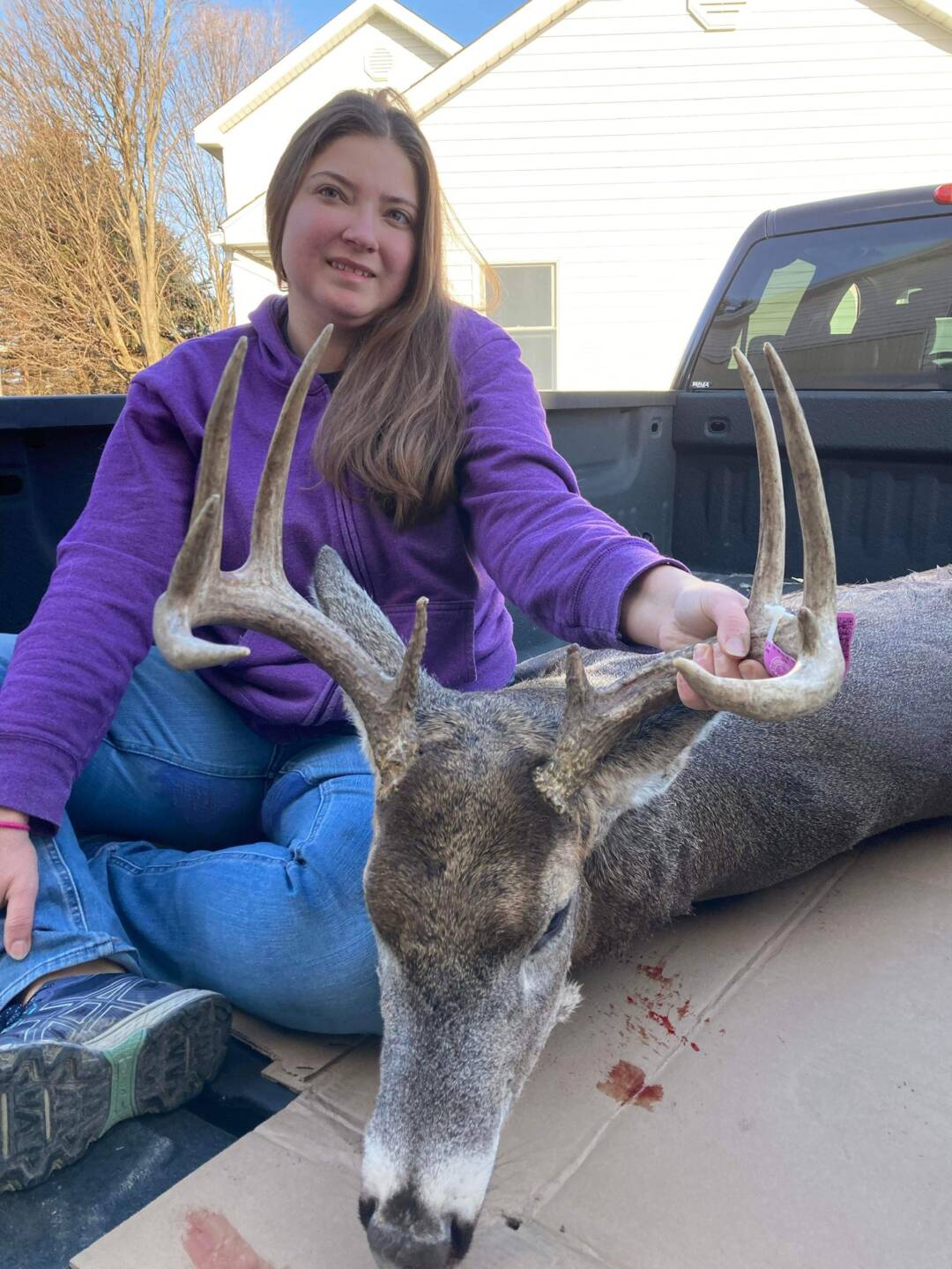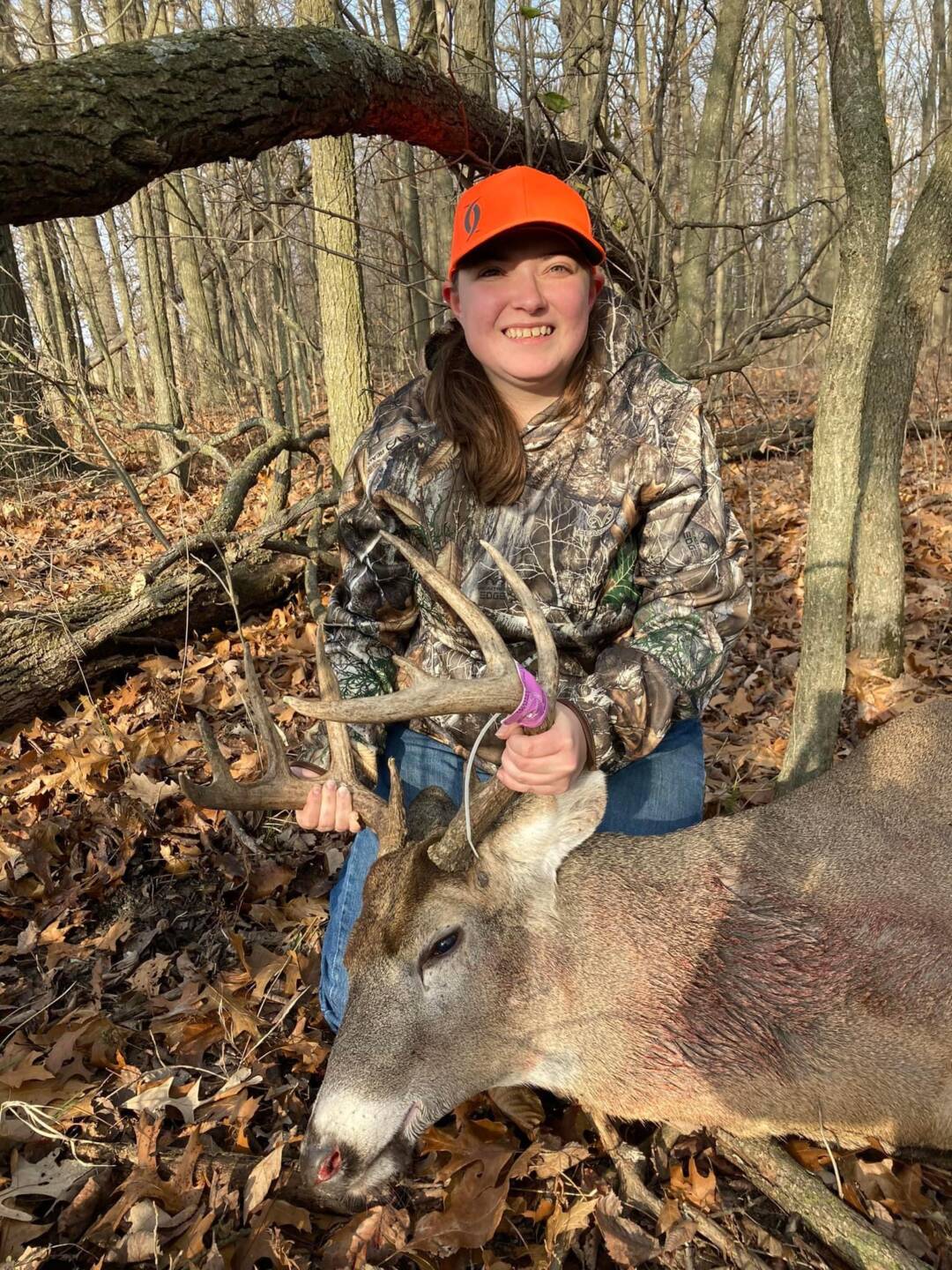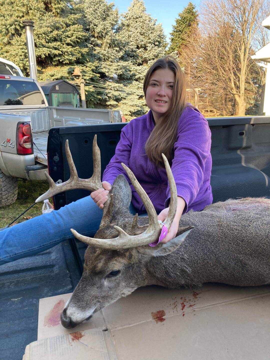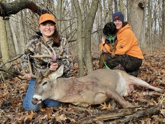 Came out sniffing where a yearling doe had been bedded down. First shot dropped him in his tracks but he got back up. Shot again was as he was headed back into the woods. Backed off and gave him some time, but blood trail ended so we called out a dog. The dog basically led us right to him!