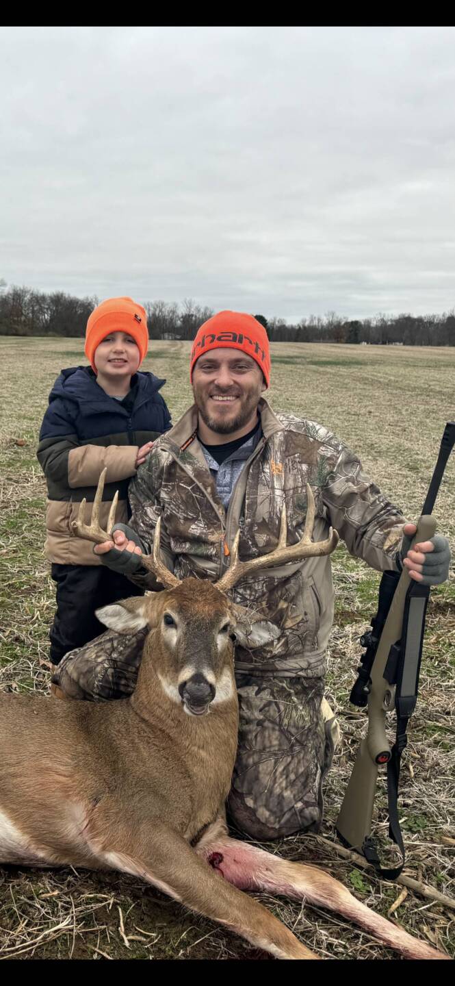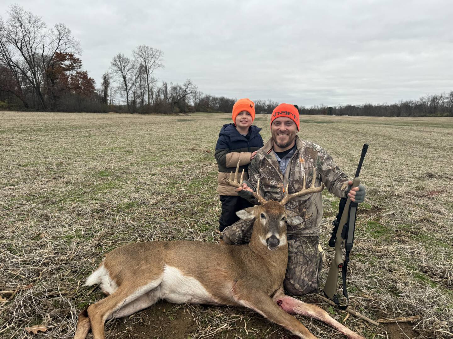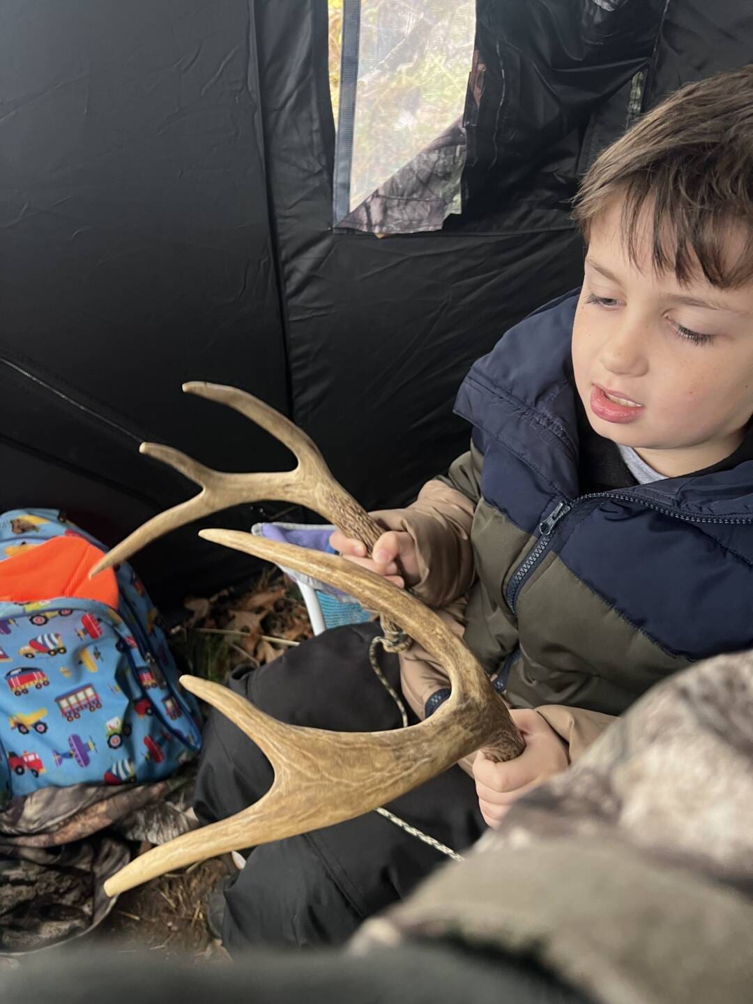 My son’s first time in the blind was quite the eventful one! He even helped me rattle a bit and after taking turns about 5 minutes later, our buck popped out of the woods at about 60 yards giving us a perfect broadside shot. He ran 50 yards or so and we watched him drop!
