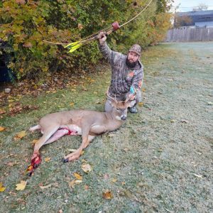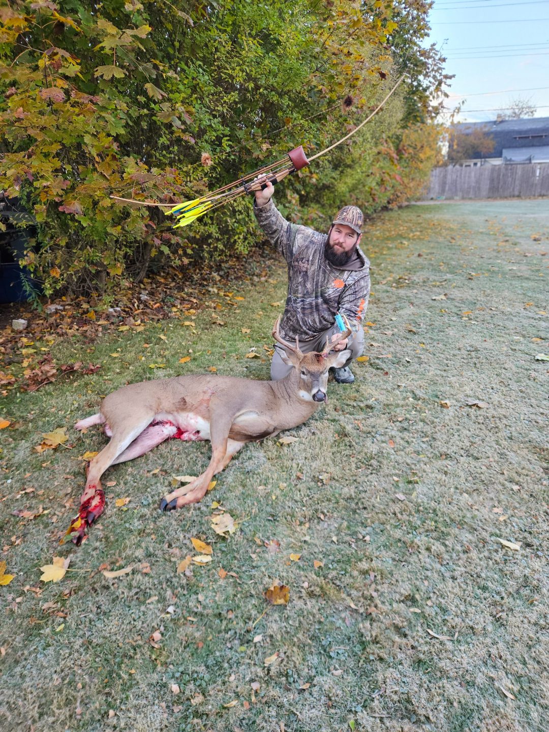 Bumping does around just after daylight running off smaller bucks , then got into a 5 to 6 minute clash with another buck and got his butt kicked he ran from that buck and stopped broadside at 13 yards, punched his heart and the rest is history