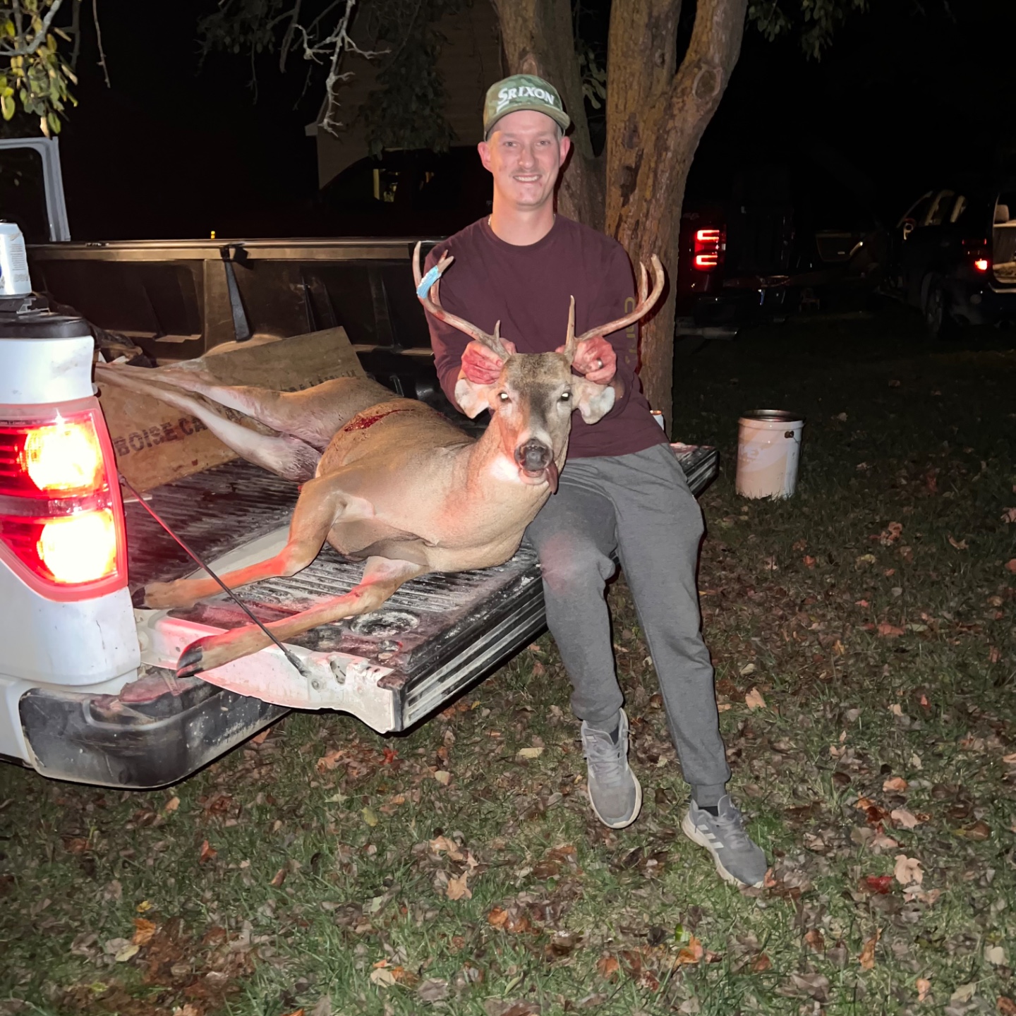 Came out of a corn field about 55 yards out following a does scent. That was grazing in the soy bean field watched him walk down threw the creek and stopped him at 40 yards made a great shot threw the pump station piled up about 150 yards away.